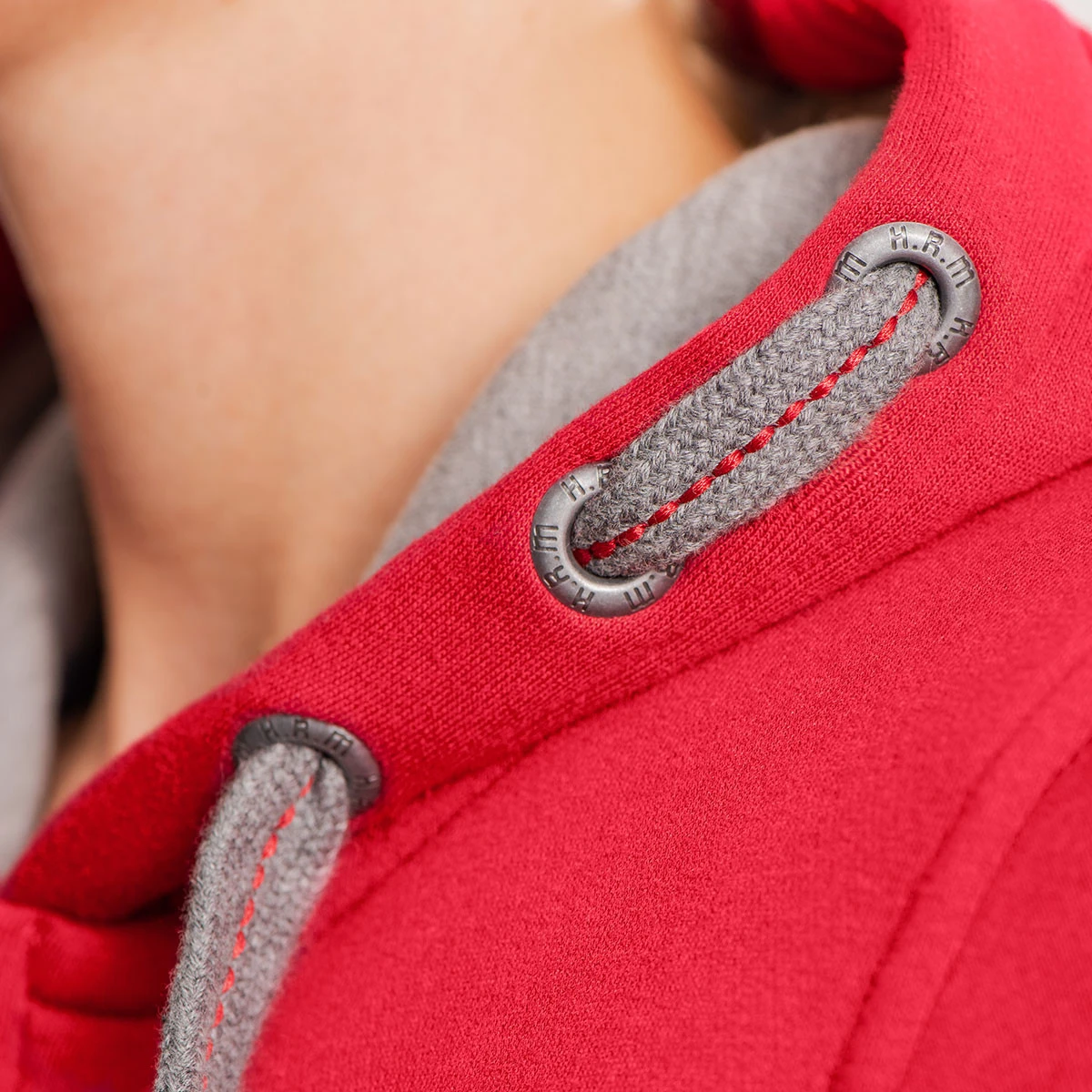 Eine flache Ton-in-Ton-Kordel mit mittiger Stickerei, je drei Metallösen im Antik-Look pro Seite sowie ein robuster Reißverschluss mit HRM-Metallschieber unterstreichen die wertige Optik. Breite 2×2 Rippstrickbündchen an Ärmeln und Saum des Ladies Hooded Jacket sorgen für elastischen, formstabilen Sitz.